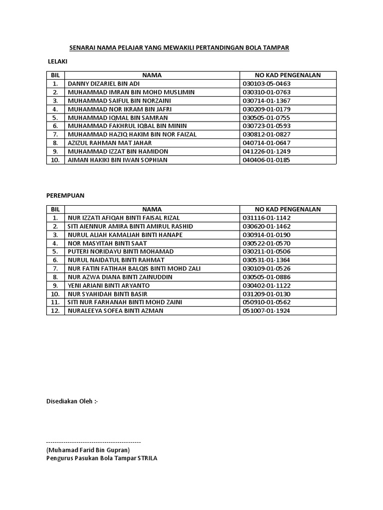 Senarai Nama Pelajar Yang Mewakili Pertandingan Bola Tampar Pdf