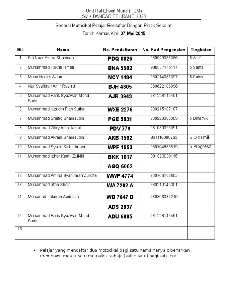 Senarai Nombor Pendaftaran Motosikal Pelajar Berdaftar Dengan Pihak Sekolah Pdf
